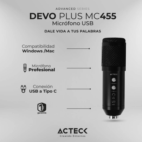 Micrófono Profesional DEVO PLUS MC455 ADVANCED SERIES ACTECK Micrófono Profesional, Patrón polar Supercardioide, Respuesta de Frecuencia 20 Hz ~ 20 kHz, Relación señal-ruido 78 dB, Sensibilidad -36 dB ± 2 dB, Condensador + Tripie + Filtros de sonido/, Conexión USB C, Color Negro. AC-936446
